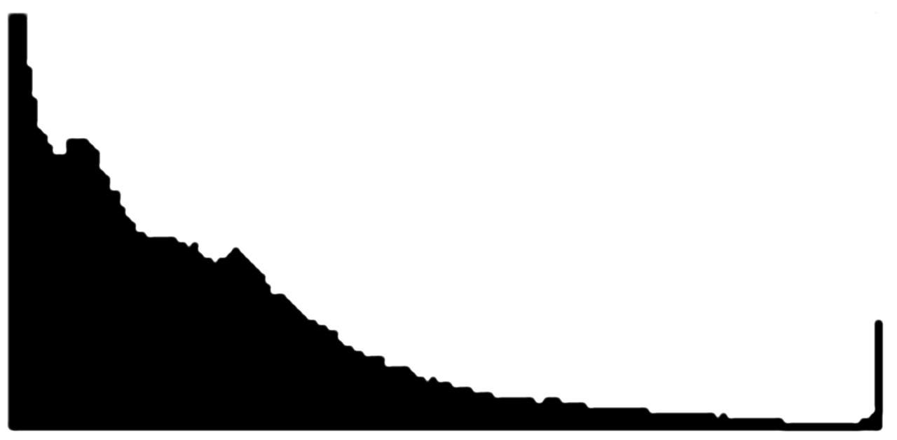 Гистограмма к фото 1а показывает преобладание провальных темных деталей в кадре с небольшой зоной пересветов в светлых его частях. Пересветы обозначены тонкой вертикальной полоской в правой части графика.