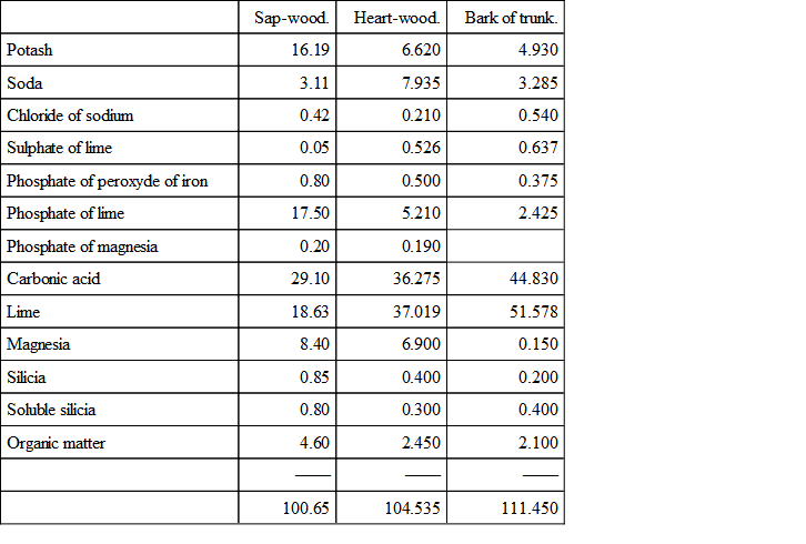 This table will indicate the application of plenty of wood-ashes and charcoal; lime in hair, bones, horn-shavings, old plaster, common lime, and a little common salt. Lime and ashes, or dissolved potash, are indispensable on an old orchard; they will improve the fruit one half, both in quantity and quality.