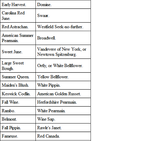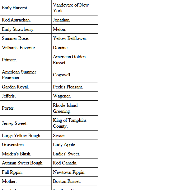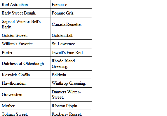 We did think of describing minutely a few of the best varieties, adapted to the different seasons of the year. But we can see no advantage it would be to the great mass of cultivators, for whom this book is designed. Those who wish to acquaint themselves with those descriptions will purchase some of the best fruit-books. We shall content ourselves with giving the lists, recommended by the best authority, for different sections, followed by a general description of the qualities of a few of the best. Downing's lists are the following:—