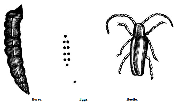 Apple-tree borer.—This is a fleshy-white grub, found in the trunks of the trees. It enters at the surface of the ground where the bark is tender, and either girdles or thoroughly perforates the tree, causing its death. This is produced by a brown and white striped beetle about half an inch long. It does not go through its different stages annually, but remains a grub two or three years. It finally comes out in its winged state, early in June, flying in the night and laying its eggs. If the borers are already in the tree, they may be killed by cutting out, or by a steel wire thrust into their holes. But better prevent them. This can be done effectually by placing a small mound of ashes or lime around each tree early in the spring.