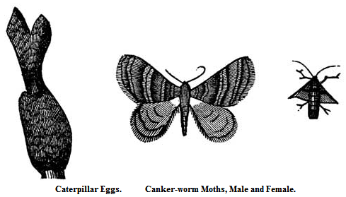 Canker-worm.—The male moth has pale-ash colored wings, with a black dot, and is about an inch across. The female has no wings, is oval in form, dark-ash colored above, and gray underneath. These rise from the ground as early in spring as the frost is out. Some few rise in the fall. The females travel slowly up the body of the tree, while the winged males fly about to pair with them. Soon you may discover the eggs laid, always in rows, in forks of branches and among the young twigs. Every female lays nearly a hundred, and covers them over carefully with a transparent, waterproof glue. The eggs hatch from May 1st to June 1st, according to the latitude and season, and come out an ash-colored worm with a yellow stripe. They are very voracious, sometimes entirely stripping an orchard of its foliage. At the end of about four weeks they descend to the ground, to remain in a chrysalis state, about four inches below the surface, until the following spring. These worms are very destructive in some parts of New England, and have been already very annoying, as far west as Iowa. They will be likely to be transported all over the country on young trees. Many remedies are proposed, but to present them all is only to confuse. The best of anything is sufficient. We present two, for the benefit of two classes of persons. For all who have care enough to attend to it, the best remedy is to bind a handful of straw around the tree, two feet from the ground, tied on with one band, and the ends allowed to stand out from the tree. The females, who can not fly, but only ascend the trunk by crawling, will get up under the straw, and may easily be killed, by striking a covered mallet on the straw, and against the tree below the band. This should be attended to every day during the short season of their ascent, and all will be destroyed. Burn the straw about the last of May. But those who are too indolent or busy to do this often till their season is past, may melt India-rubber over a hot fire, and smear bandages of cloth or leather previously put tight around the tree. This will prevent the female moth from crossing and reaching the limbs. Tar is used, but India-rubber is better, as weather will not injure it as it will tar, so as to allow the moth to pass over. Put this on early and well, and let it remain till the last of May. But the first, the process of killing them, is far the best.