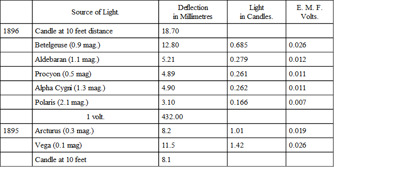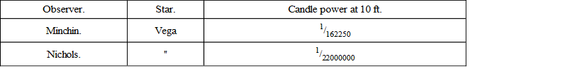 In the years 1900 and 1901 Mr. E.F. Nichols of the Yerkes Observatory made a series of experiments with a radiometer of special construction, to determine the heat emitted by certain stars. The result arrived at was, that Vega gave about 1/200000000 of the heat of a candle at one metre distance, and Arcturus about 2.2 times as much.