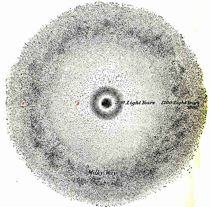 It must be clearly understood that these two illustrations are merely diagrams to show the main features of the stellar universe according to the best information available, with the proportionate dimensions of these features, so far as the facts of the distribution of the stars and the views of those astronomers who have paid most attention to the subject can be harmonised. Of course it is not suggested that the whole arrangement is so regular as here shown, but an attempt has been made by means of the dotted shading to represent the comparative densities of the different portions of space around us, and a few remarks on this point may be needed.