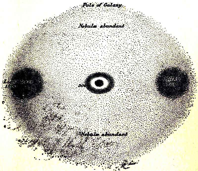 In the enormous space between our cluster and the Milky Way, and also above and below its plane to the poles of the Galaxy, stars appear to be very thinly scattered, perhaps more densely in the plane of the Milky Way than above and below it where the irresolvable nebulæ are so numerous; and there may not improbably be an almost vacant space beyond our cluster for a considerable distance, as has been supposed, but this cannot be known till some means are discovered of measuring parallaxes of from one-hundredth to one five-hundredth of a second.