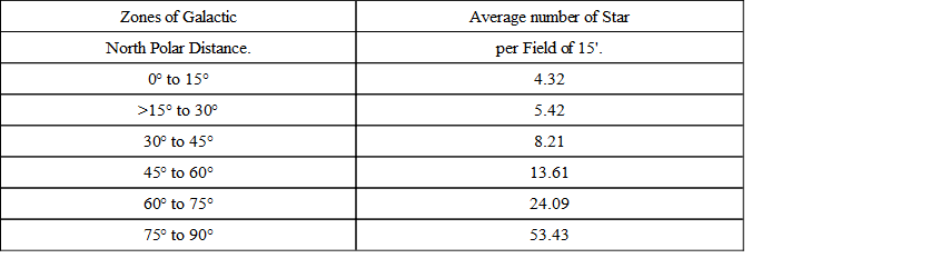 In order to show the enormous difference of star-density in the Galaxy and at the galactic poles, Professor Newcomb gives the following table of the Herschelian gauges, on which he only remarks that they show an enormously increased density in the galactic region due to the Herschels having counted so many more stars there than any other observers.