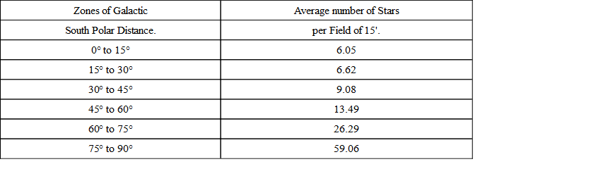 Later on Professor Seeliger of Munich made an investigation of the relation of more than 135,000 stars down to the ninth magnitude to the Milky Way, by dividing the whole of the heavens into nine regions, one and nine being circles of 20° wide (equal to 40° diameter) at the two poles of the Galaxy; the middle region, five, is a zone 20° wide including the Milky Way itself, and the other six intermediate zones are each 20° wide. The following table shows the results as given by Professor Newcomb, who has made some alterations in the last column of 'Density of Stars' in order to correct differences in the estimate of magnitudes by the different authorities.