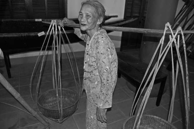 Хозяйка музея – миниатюрное солнечное создание в элегантном брючном костюме и с ниткой ослепительного жемчуга на шее – исполнила для нас старинную колыбельную песню, качая в руках плетеную люльку для новорожденных младенцев. Потом показала, как торговцы раньше носили на плече свой товар – в двух чашах, подвешенных с помощью гибких прутьев на длинной палке (вроде нашего коромысла). Продемонстрировала, как спали крестьяне на низкой деревянной кровати без намеков на постельное белье, подкладывая под голову зашкуренное полено вместо подушки (никогда, кстати, не страдали от хондрозов – возьмите-ка это себе на заметку, дети современной цивилизации). Под конец она взяла в руки здоровенный деревянный молот (величиной в половину ее роста) и с силищей, весьма неожиданной для такого тщедушного тельца, постучала им о чашу каменной ступы, показывая, как в давние времена вьетнамцы измельчали зерно, превращая его в муку, а также делали порошки.