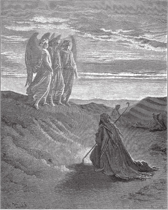 Под дубом Мамврийским сидел Авраам.И очи возвел он к далеким холмам,И тут же очам не поверил своим:Три ангела светлых стояли пред ним.Блистали их лики красою лилей,И снега одежды казались белей, –И пал Авраам перед ними во прах,И странников чудных, в смиренных речах,Молил отдохнуть он в тени, у шатра,Пока не спадет над долиной жара.Он путникам ноги босые омылИ сам за трапезой Господней служил.Он выбрал им лучшего агнца из стад;Душистые фиги, миндаль, виноградИ мед золотистый, густой, как смола,И хлебы, которые Сарра пекла,Поставил пред ними в древесной тени.Вкусив, вопросили у старца они:«Где Сарра – подруга твоя и жена?»Сказал он: «В шатре, за работой она».И молвил из чудных пришельцев один:«Чрез год у жены твоей ро́дится сын!»Услышала Сарра и слову томуВ душе рассмеялась, не веря ему:«Возможно ль, чтоб это случилося вдруг, –Стара я, и в летах преклонных супруг».Но странник чудесный промолвил в ответ:«Узнай: для Творца невозможного нет;Сказал Он – и будет! Чрез год я опятьУвижу здесь Сарру – счастливую мать».И, молвив, восстали они и пошли,И скрылися скоро в волнистой дали.Чудесных гостей проводил Авраам,А Сарра стояла, не веря очам,И долго вослед им, тревогой полнаИ трепетом тайным, глядела жена,Не в силах сомнений своих побороть.Чрез год совершилось, как молвил Господь.Три ангела