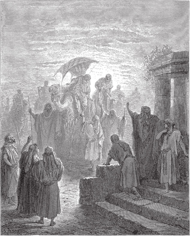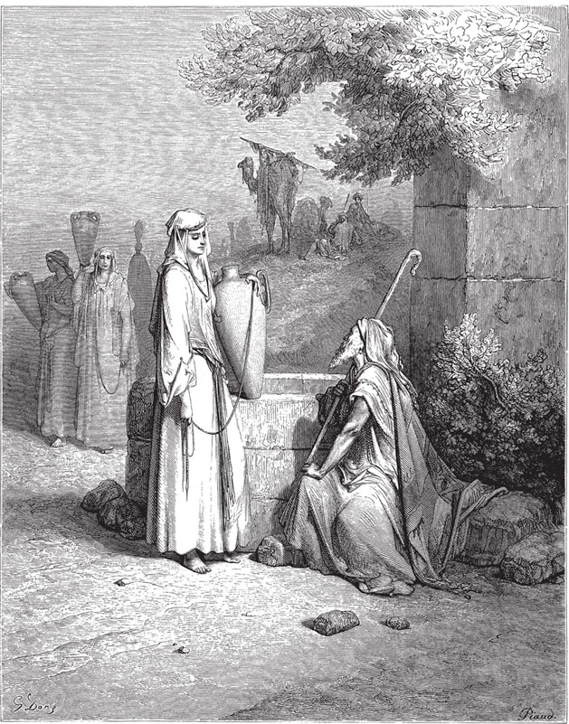 Старея, рабу Авраам поручилНайти Исааку невесту,И тот, повинуясь ему, поспешил,Не медля, к урочному месту.С ним десять верблюдов с подарками шли;И так со своим караваномВступил он в пределы далекой земли,В тот город, что звался Харраном.Был вечер, и час приближался, когда,Легки и пугливы, как серны,Стекалися юные девы туда –Наполнить кувшин у цистерны.И к Богу воззвал он: «Щедроты своиЯви господину, о Боже!Да будет та дева достойна любви,С которой разделит он ложе.Тебе господина вручая судьбу,Я жду откровенья иль знака:Пусть дева, подавшая воду рабу,И станет женой Исаака».И так изливал он всю душу в мольбах;К цистерне меж тем подходилаРевекка с кувшином блестящим в руках –Прекрасная дочь Вафуила.И странник сказал ей: «Наполни кувшин,Чтоб мог я напиться оттуда».Она же ответила: «Пей, господин,А я напою и верблюда».Восславил Всевышнего Елеазар;Залогом грядущего счастьяНевесте избранной немедленно в дарОн серьги вручил и запястья.Чрез несколько дней выступал караван,Скрываясь за далью от взора,И с ним покидала навеки ХарранПрекрасная внучка Нахора.Ревекка и Елеазар