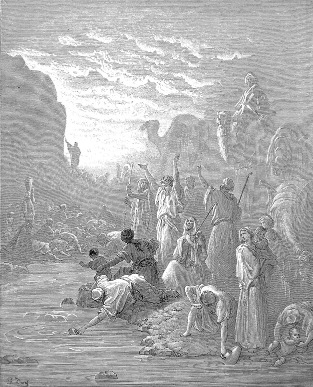МОИСЕЙ ИСТОЧАЕТ ВОДУ ИЗ СКАЛЫ. ЧИСЛА, ГЛ. 20, СТ. 11. И поднял Моисей руку свою, и ударил в скалу жезлом своим дважды, и потекло много воды, и пило общество и скот его.