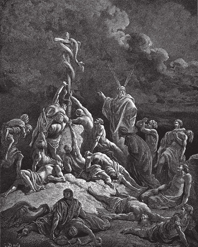 Высоко над безбрежной пустынеюПеленой ослепительно синеюРасстилается неба полдневного свод.Впереди – лишь пески распаленные…И поникли главой утомленные,Возроптал иудейский народ.К Моисею пришли недовольные.«Для того ли – рабы подневольные –Из Египта мы шли за тобой,Чтоб завел нас в пустыни бесплодные,Где теперь погибаем голодные,Где томят нас и жажда, и зной?»И Господь, наделивший их манною,Им сиявший над степью песчаною,Прогневясь на роптавших, послалЗмей-сарафов, – и многих в ИзраилеЯдовитые змеи ужалили,И без счета народ погибал.И, явясь к Моисею в смятении,Вновь молили они о прощении;И Всевышнего он умолил:Змия медного, им изваянного,Пред очами народа избранногоВысоко Моисей водрузил.Истомленные тяжким страданием,Поднимались к нему с упованиемУгасавшие взоры людей.Кто бы ни был из сонмища бедного,Всякий, змия увидевши медного,Исцелялся от боли своей.