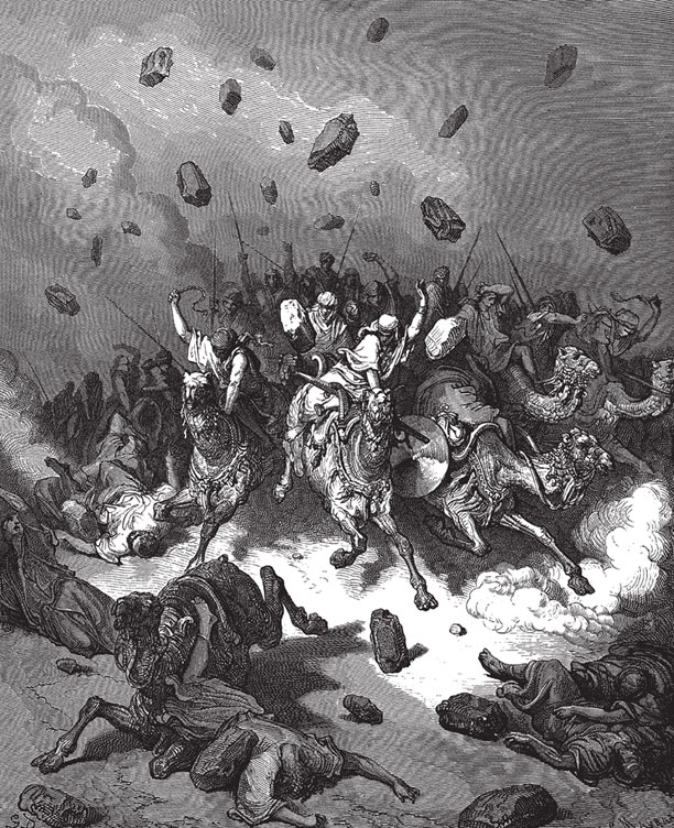 ПОРАЖЕНИЕ ЦАРЕЙ АМОРРЕЙСКИХ. КНИГА ИИСУСА НАВИНА, ГЛ. 10, СТ. 11. Когда же они бежали от Израильтян по скату горы Вефоронской, Господь бросал на них с небес большие камни [града] до самого Азека, и они умирали…