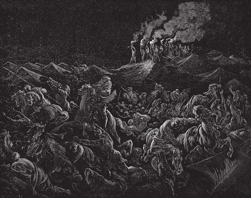 БЕГСТВО МАДИАНИТЯН. КНИГА СУДЕЙ ИЗРАИЛЕВЫХ, ГЛ. 7, СТ. 20. И затрубили все три отряда трубами, и разбили кувшины, и держали в левой руке своей светильники, а в правой руке трубы, и трубили, и кричали: «меч Господа и Гедеона!»