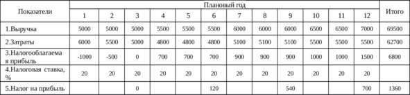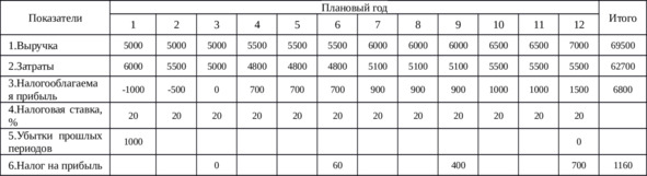 В целом за весь год налог на прибыль составит 1 160 тыс.руб. Его величина меньше значений предыдущей таблицы на 200 тыс.руб., а это ровно 20% от размера убытков прошлых периодов.