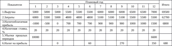 За первое полугодие налогооблагаемая прибыль составит 600 тыс.руб., налог на прибыль – 60 тыс.руб. (0,5×0,2×600—0=60).
