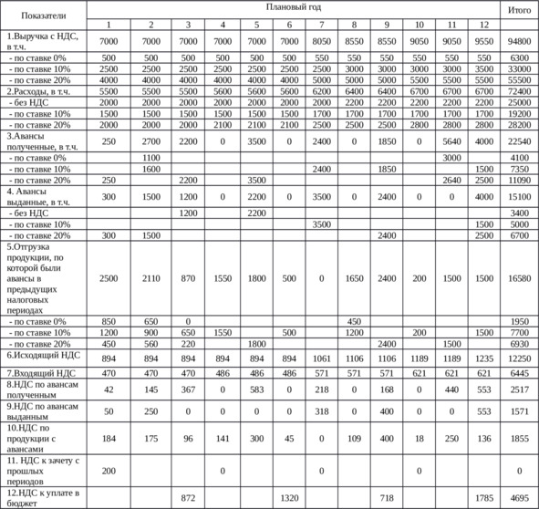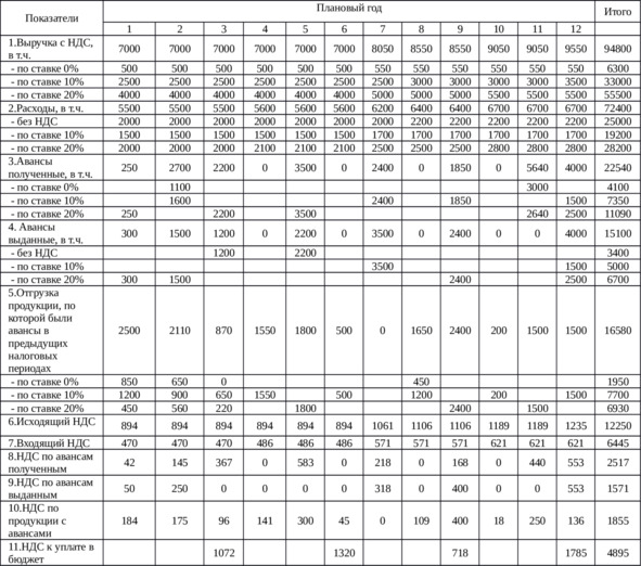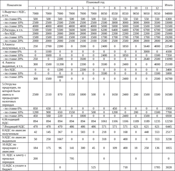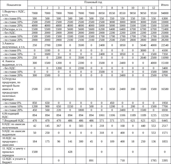 Исходящий и входящий НДС, НДС по авансам полученным и НДС по авансам выданным, НДС по продукции, по которой были авансы определены с учетом ставок налога. Например, НДС по авансам полученным в первом месяце составит 42 тыс.руб. (20×250/120=42), НДС по авансам выданным – 50 тыс.руб. (20×300/120=50), НДС по продукции с авансами -184 тыс.руб. (0×850/100+10×1 200/110+20×450/120=184).