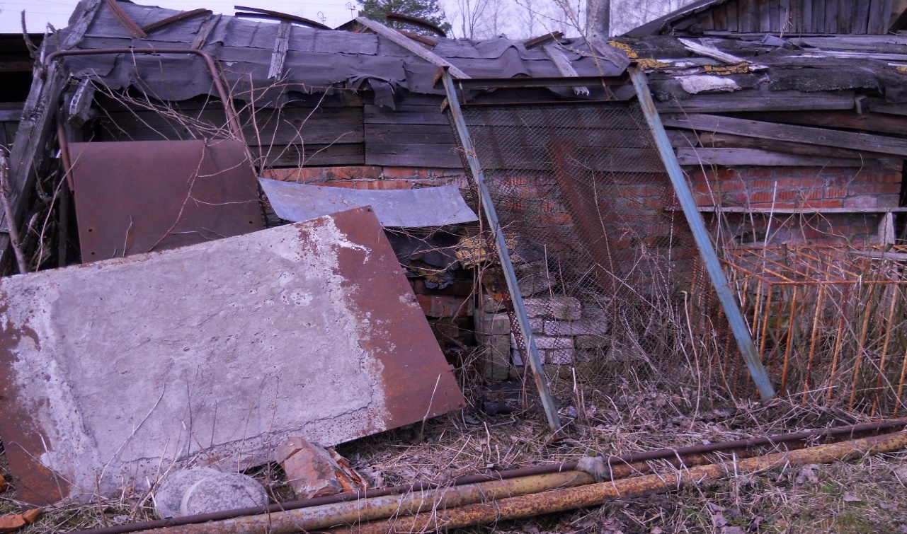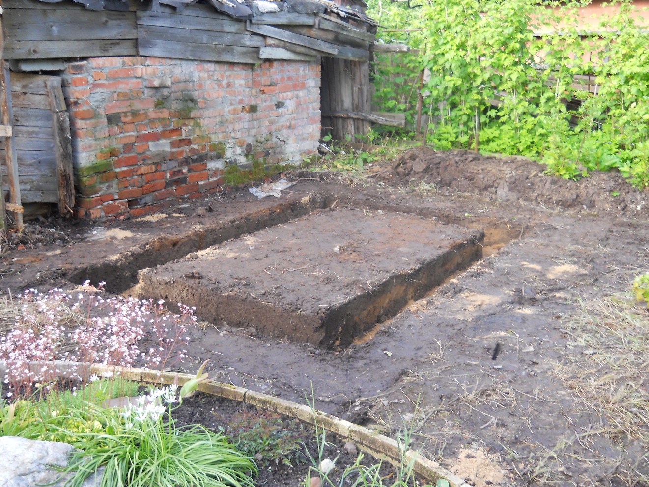 На месте компостной кучи было выбрано место под баню. Удобно, соседям солнце не загораживает и вдобавок повод разобрать хлам, складируемый годами! Вот такой вот интересный пейзаж! Хлам разобрали быстро, а вот дальше начались проблемы. Дело в том, что участок расположен на месте бывшего болота, грунт торф разной степени разложения. Т.е. несущая способность очень низкая, перекосит баню первой же весной. На форуме мужики посоветовали делать мелко-заглубленный фундамент. Попросту говоря, копается траншея и заполняется песком, сверху ставится опалубка и заливается бетон.