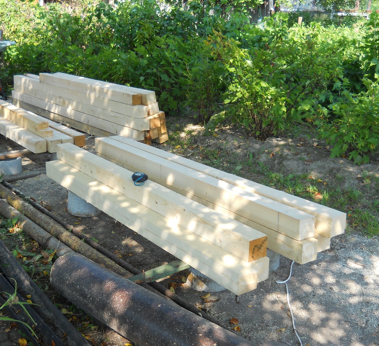 Самое интересное, брус нам сделали из хорошего, зимнего леса, который вылежался с зимы в бревнах и был распилен в середине лета. Это нам потом уже грамотный специалист подсказал. На торцах бруса темно-коричневый цвет и сеть мелких трещинок, а сам брус белый, то есть дерево было спилено минимум полгода назад зимой, в январе-феврале! Забегая вперед, скажу, что повело и выперло на 20мм один брус, два бруса дали трещины и еще на одном большой потек смолы, что, согласитесь, весьма неплохо, 1-2% некондиции.