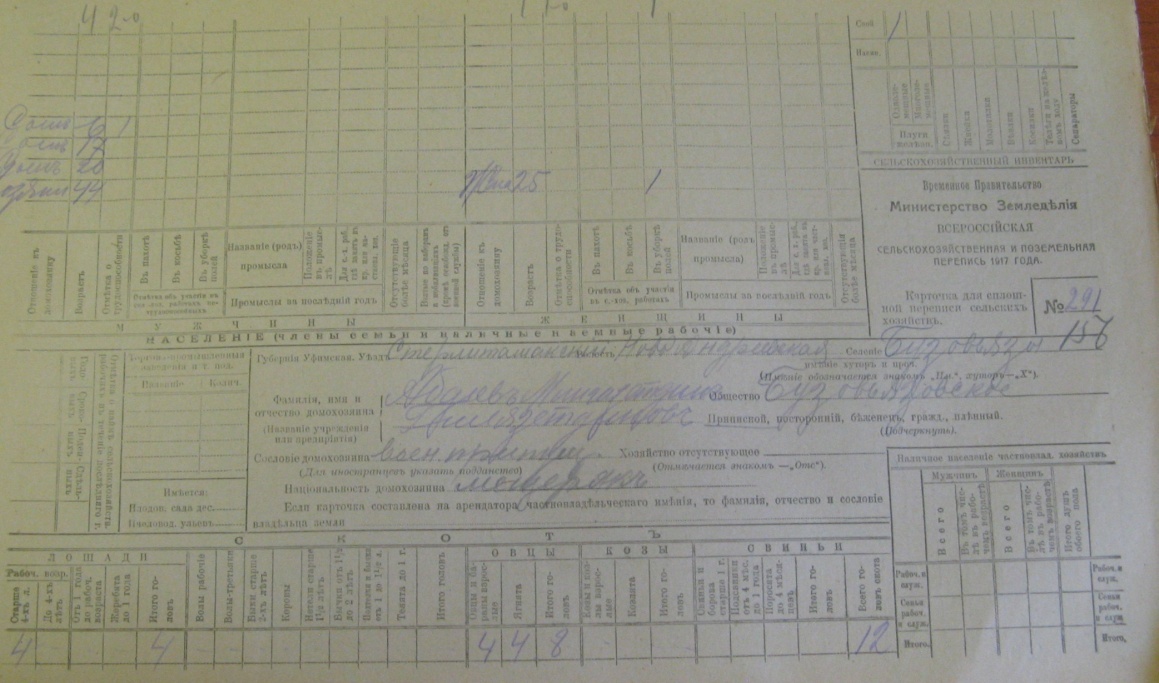 451/361. Идиятулла Мухаметкаримов сын Абдеев (1883–после 1917). По данным переписи 1917 года записан в подворной карточке №283. Абдиев Идиятулла Мухаметкаримов 33 лет (в армии). Военный припущенник, мещеряк. Сын 6. Жена 28. Дочери 9, 3 лет. В хозяйстве 1 рабочая лошадь, корова, подтёлок, 6 овец, 1 коза. Надельной укреплённой чересполосной земли (3/4 души): усадьба – 0,17, пашни – 3,6, сенокоса – 0,16, остальных угодий – 2,57 дес. Всего 6,5 дес. Сдает в аренду в своей общине 0,11 дес. озимых на 1 год за деньги. Под посевами и паром (в дес. 2400 кв.саж.): озимой ржи – 1,33 дес., овса – 0,33, проса – 0,33, гречи – 0,5 дес. Всего 2,49 дес. Пара 1 дес. Итого 3,49 дес.