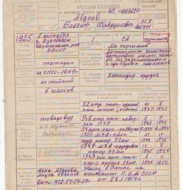 482/453. Баязит Хайруллович Абдеев (1925 г.р.). Участник Великой Отечественной войны. Призван на службу в январе 1943 года. Младший сержант, командир зенитного орудия. 20 октября 1943 года был ранен в правую ногу. Уволен в запас 28 января 1950 года. Жена – Анузя Назиповна Абдеева.