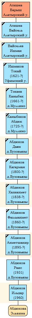 63/48. Фазлыахмет Хазиахметов сын Абдюков (1860-после 1917). По данным Всероссийской сельскохозяйственной переписи 1917 года показан в подворной карточке №565: Абдюков Фазлыахмет Хазиахметов 57 лет. Военный припущенник, мещеряк. Сыновья 22 (в армии), 20 (в армии), 16. Жена 40. Дочь 5 лет.Жена – Фархиямал.