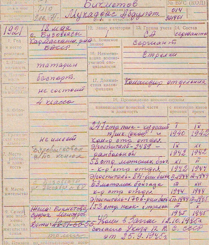 224/155. Мукаддас Абдулгатинович Бикметов (1921-?). Призван на военную службу в январе 1940 г. Службу начал курсантом полковой школы 247-го стрелкового полка. В Великой Отечественной войне участвовал с 24 июня 1941 г. В сентябре 1942 г. был легко ранен в левое предплечье и левую ногу, проходил излечение до ноября 1942 г. в эвакогоспитале №2489. С ноября 1942 до февраля 1944 г. командир стрелкового отделения 58-й отдельной мотомеханизированной бригады. С февраля по март 1944 г. на излечении в эвакогоспитале №871. С марта до декабря 1944 г. командир стрелкового отделения 63-й отдельной мотомеханизированной бригады. Затем до марта 1945 г. на излечении в эвакогоспитале №1706. С марта по октябрь 1945 г. служил в 153-м стрелковом полку. Демобилизован в октябре 1945 г. Жена – Суфия Мансуровна Бикметова.