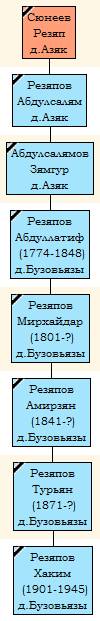 14/6. Абдуллатиф Зямгуров сын Резяпов (1774-1848). Житель д. Бузовьязы. Кантонный начальник 14-го класса. Жены: 1-я – Сарвихароман (1785–?): 2-я – Абдуллатифова Махбубзямал (1811–после 1850).