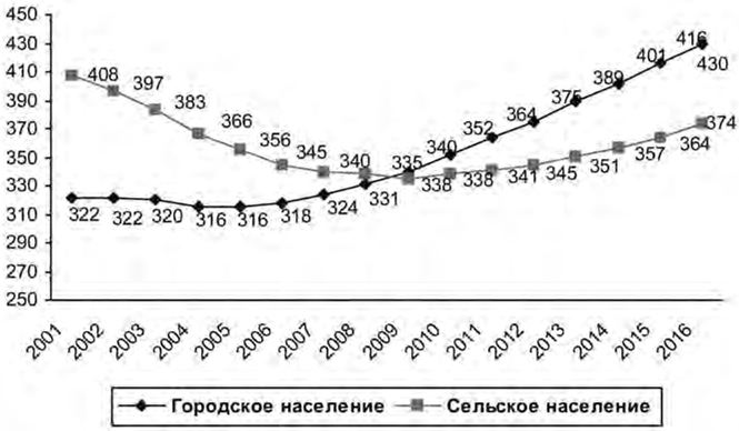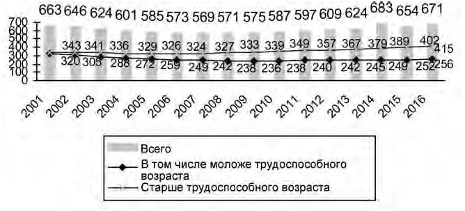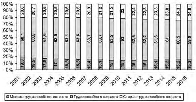 Согласно социально-демографическому прогнозу к 2016 г. возрастная структура населения претерпит существенные изменения, низкая рождаемость и рост ожидаемой продолжительности жизни приведут к увеличению доли лиц старших возрастов в структуре населения до 24,8 % (рис. 1.1).