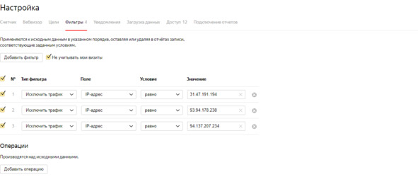 Чтобы не искажать статистику, рекомендую исключить трафик владельца сайта и подрядчиков. Для этого в «Яндекс. Метрике» есть фильтры – поставьте галочку «Не учитывать мои визиты» и внесите в список IP-адреса всех тех, кто занимается продвижением и тестированием сайта.