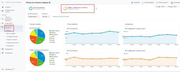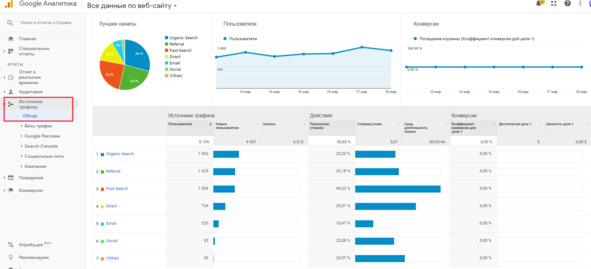 В нем мы можем увидеть, какая доля трафика приходится на тот или иной источник, какие его базовые показатели эффективности, в виде базовых пользовательских показателей, и конверсионности по необходимым целям.