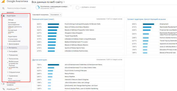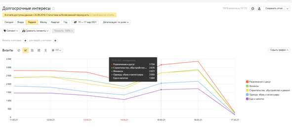 К примеру, вот так выглядит отчет «долгосрочные интересы», здесь мы можем оценить интересы пользователей, динамику их заходов.