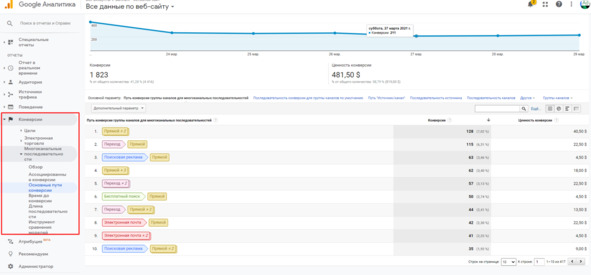 Из интересного можно выделить блок отчетов «Многоканальные последовательности», которые позволяют определить путь по каналам продвижения, которые совершают пользователи, до конверсии. Его так же можно сегментировать по различным показателям и понимать, какой сегмент пользователей в каких каналах и скольких каналах нуждается для совершения конверсии.