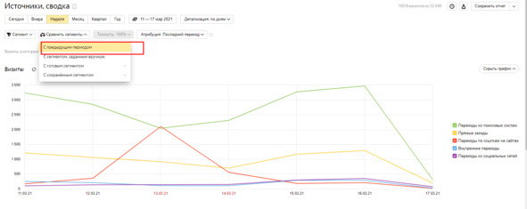 Чтобы оценивать ситуацию объективно, лучше сравнивать временной отрезок с аналогичным периодом в прошлом году. Для этого нужно нажать на «Сравнить сегменты» и выбрать «С предыдущим периодом».
