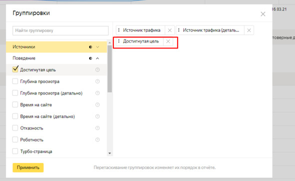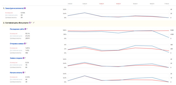 Особое внимание нужно уделить целевым посетителям – потенциальным клиентам, которые достигли определенных целей: оформили корзину, заказали звонок и т. д. Данный отчет можно посмотреть в Отчете – Конверсия.