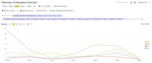 Сервис Яндекс. Метрики дает возможность создавать свои отчеты. Для этого нужно перейти в «Мои отчеты», затем нажать на «Новый отчёт». Далее просто добавьте все необходимые метрики, проставьте условия и сохраните. Например, так мы искали посетителей по брендовым запросам.