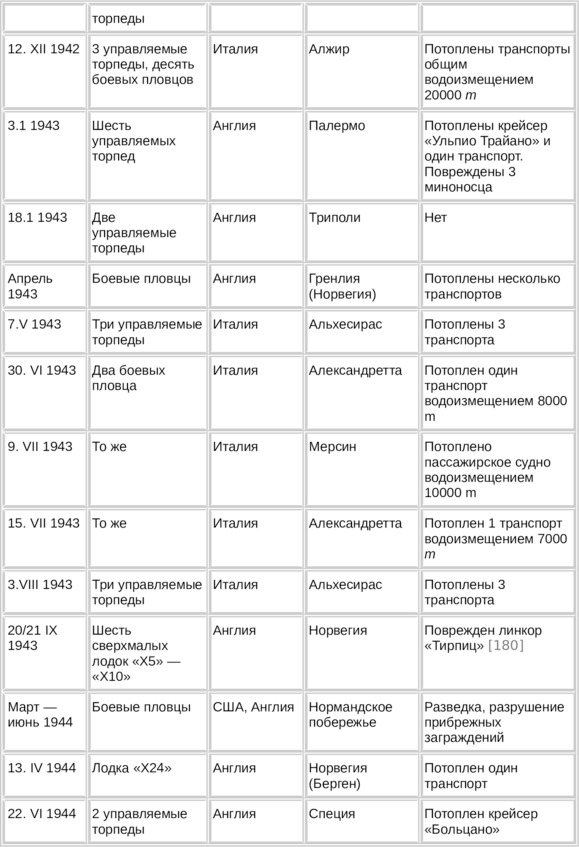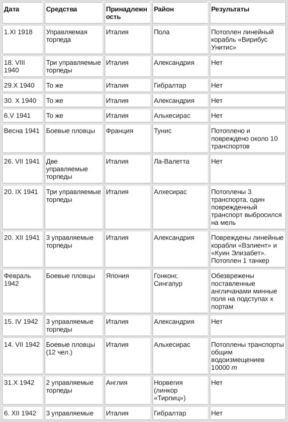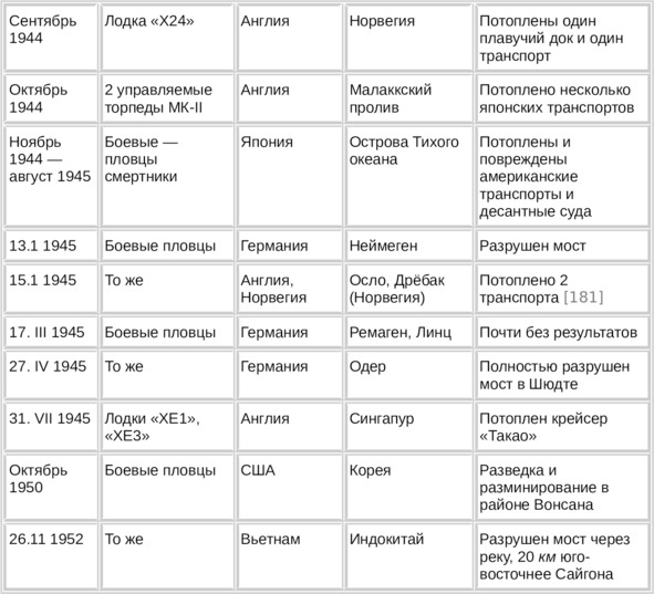 Итоги деятельности боевых пловцов иностранных государств в период второй мировой войны приведены в таблице 1.