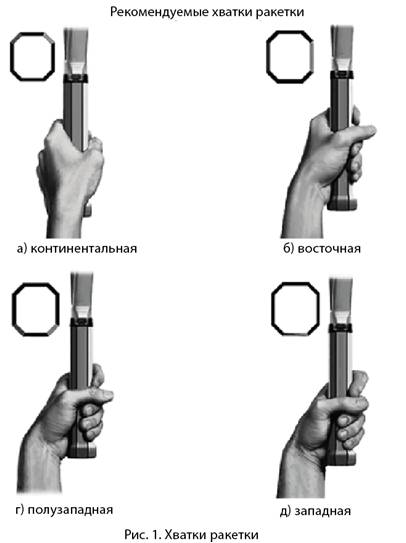 Итак, решено, начинаем знакомство с традиционной теорией тенниса с того, как спортсмен держит ракетку, или, как принято говорить, с хвата (хватки) ракетки теннисистами. В настоящее время теннисная теория рекомендует несколько различных хватов ракеток. Например, в статье, «Контроль над положением ракетки», опубликованной в Интернете от 13 мая, 2013 г., в «Основах техники тенниса» приведены названия этих хваток и варианты их использования при игре на корте. Схемы этих хватов представлены на рис. 1.