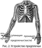 И сустава в локте тоже два – локтевой и лучевой. У локтевой и лучевой кости, с точки зрения управления кистью, разные функции. Движение локтевой кости перемещает кисть относительно плечевого сустава (приближает или удаляет). А движение лучевой кости (супинация или пронация) поворачивает ладошку по направлению вверх или вниз, вперёд или назад и т. д., в зависимости от направления локтевой кости.