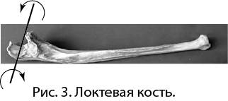 Рассмотрим двигательные возможности локтевой кости в локтевом суставе. Посмотрим на рис. 3 и отметим, что локтевой сустав блоковидный. Это означает что движения локтевой кости возможны только в плоскости, определённой плечевой и локтевой костями. Эти движения, разгибание или сгибание, происходят относительно оси, перпендикулярной плоскости, в которой расположены плечо и предплечье. На рис. 3 эта ось вращения изображена как линия со стрелочками возле неё, которые показывают направления вращения.