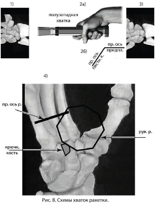 Пр. ось пястн. к., пр. ось предпл, пр. ось р. – продольные оси пястных костей предплечья и ракетки; крючк. кость – крючковидная кость; рук. р. – рукоятка ракетки.
