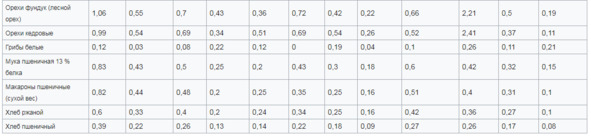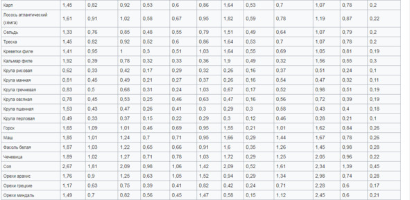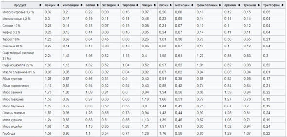 Ниже представлена таблица с содержанием аминокислотного состава в продуктах питания.