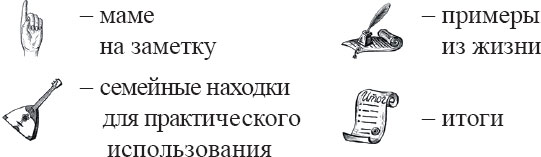 * * *По мере написания книги, у меня возникло желание во-первых, обозначить главные моменты, на которых важно акцентировать внимание, во-вторых, выделить игры, потешки и другие практические вещицы, которые могут привлечь внимание читателя и быть использованы им в повседневности, в-третьих, особенно выделить примеры из жизни (моей и моих знакомых), в-четвертых, выделить итоги. Так возникли значки-подсказки, предназначение которых – помочь читателю быстрее ориентироваться в тексте.