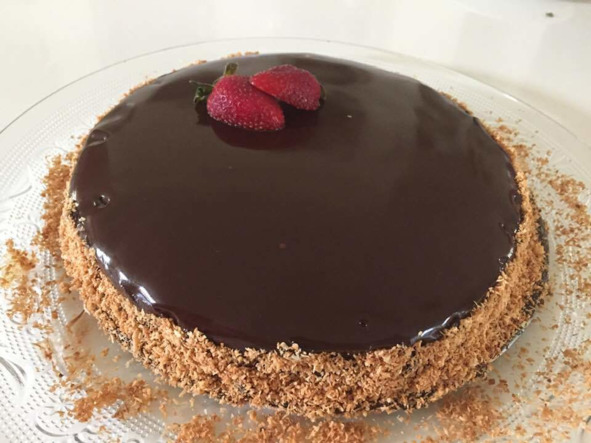 Достать из морозильной камеры застывший чизкейк, аккуратно вылить на него глазурь. Украсить жареной кокосовой стружкой.