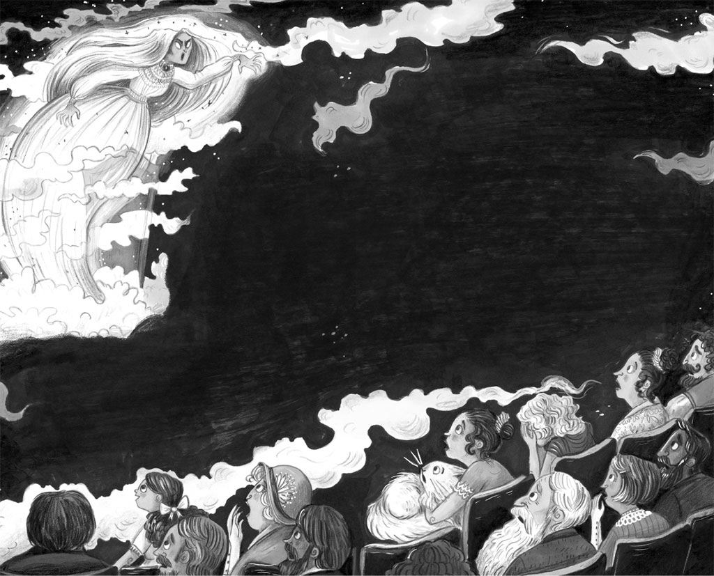 Зрительный зал ахнул, когда прозвучало последнее слово. Агнесса так крепко схватила Сильвию за руку, что та подпрыгнула от неожиданности, и Максимилиану пришлось вонзить когти, чтобы не свалиться на пол. Маг подошёл ближе к одному из надгробных камней. Наклонившись к нему, он вытянул руки, растопырив пальцы. Потом медленно начал отводить руки, как будто выманивая что-то из могилы, и через несколько секунд на сцене заклубился дым.
