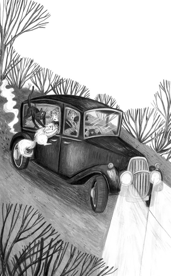 Агнесса завопила. Она подняла ноги на сиденье и так сильно сжала руку Сильвии, что та вскрикнула от боли. Потом Агнесса лягнула Оскара, а он дёрнулся и отпрыгнул как раз в тот момент, когда автомобиль резко накренился. Оскар отлетел к двери, Максимилиан прыгнул за ним, мяукая: «Без паники, это Оскар». Машина повернула, и Максимилиан почувствовал, что падает. Он попытался сохранить равновесие, лавируя хвостом, но его задняя часть перевесила. С паническим воплем оба кота вывалились из окна на землю и попали прямо в грязь. Максимилиан успел заметить, что в окне мелькнуло лицо Сильвии, и услышать, как она в тревоге звала его, но через пару секунд её голос растаял в холодном ночном воздухе. Кавалькада машин промчалась мимо них, пыль рассеялась, и Максимилиан с Оскаром остались одни в темноте. Труппа месье Лавроша умчалась в замок Фоули.