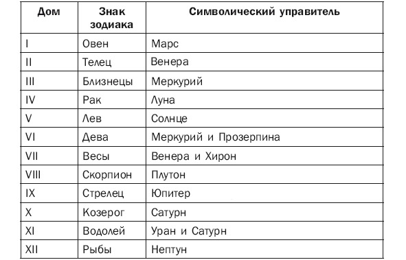 « Каждый астрологический дом в натальной карте имеет своего реального и символического управителя – Планету. Символический управитель – это хозяин того знака Зодиака, которому данный дом соответствует по номеру своей категории от 1-й – Овен до 12-й – Рыбы. Реальный управитель дома – это управитель того знака, в который попадает куспид данного дома (начало дома). Очень часто бывает, что у дома есть еще и соуправитель. Это хозяин знака, который полностью или частично находится в доме (после знака управителя). Иногда бывает, что дом такой большой, что в нем оказывается и три знака. В этом случае мы имеем дело со вторым соуправителем дома или младшим соуправителем.