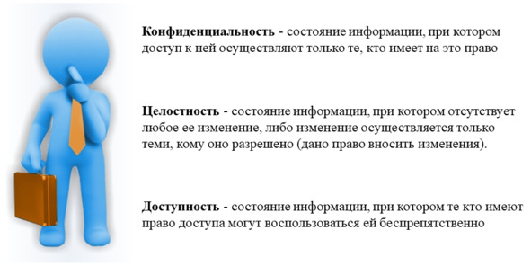 Не сильно углубляясь в теорию, можно определить «информационную безопасность», как одно из направлений корпоративной безопасности (по сути, одну из составляющих), связанную с обеспечением состояния защищенности информации, т.е. таких ее свойств как конфиденциальность, целостность и доступность (рисунок 1).