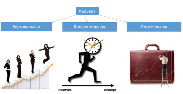 Эксперты в сфере управления персоналом выделяют три вида карьеры (они характерны для любой профессиональной сферы): вертикальная, горизонтальная и портфельная (см. рисунок 2).