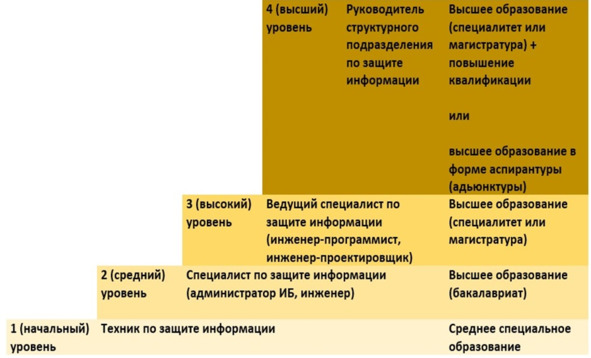 Так, в соответствии с подпунктом «а» пункта 5 «Положения о лицензировании деятельности по технической защите конфиденциальной информации» (утв. постановлением Правительства Российской Федерации от 3 февраля 2012 г. №79), для получения лицензии Федеральной службы по техническому и экспортному контролю России по технической защите конфиденциальной информации, соискатель лицензии должен иметь в штате специалистов имеющих высшее профессиональное образование в области технической защиты информации, либо высшее техническое или среднее профессиональное (техническое) образование и прошедших переподготовку или повышение квалификации по вопросам технической защиты информации. Аналогичные требования предъявляются и к соискателям лицензий Федеральной службы безопасности России, осуществляющим деятельность по криптографической защите информации.