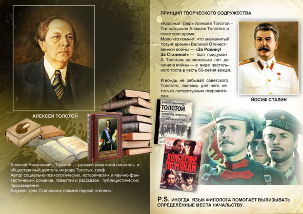 «Красный граф» Алексей Толстой – так называли Алексея Толстого в советское время. Мало кто помнит, что знаменитый лозунг времен Великой Отечественной войны – «За Родину! За Сталина!» – был придуман А. Толстым за несколько лет до начала войны – в виде застольного тоста в честь 60-летия вождя.